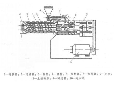 雙螺桿擠出機(jī)由傳動裝置、加料裝置、料筒和螺桿等幾個部分組成,各部件的作用與單螺桿擠出機(jī)相似,其結(jié)構(gòu)如《雙螺桿擠出機(jī)結(jié)構(gòu)示意圖》所示。與單螺桿擠出機(jī)的區(qū)別之處在于雙螺桿擠出機(jī)中有兩根平行的螺桿置于“∞” 形截面的料簡中。